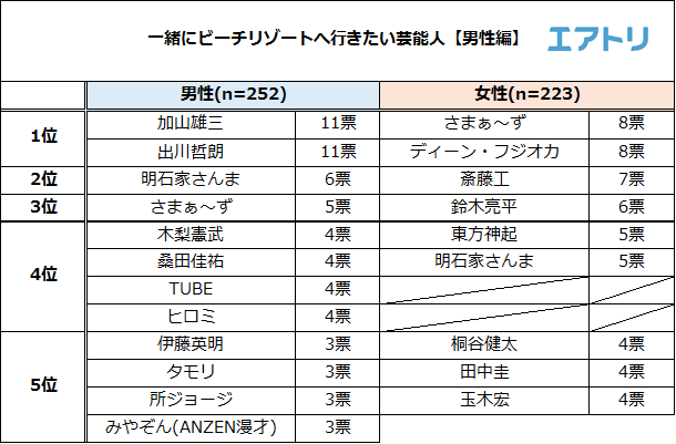 ビーチリゾートに一緒に行きたい芸能人男性は 加山雄三 と 石原さとみ 女性は さまぁ ず と 渡辺直美 株式会社エアトリのプレスリリース